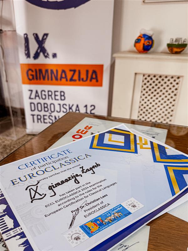 I ove nastavne godine, u petak, 29. studenog 2024. godine proveli smo međunarodno natjecanje u poznavanju latinskoga jezika i rimske kulture: Euroclassica latina (ECCL) koje se provodi istovremeno u svim zemljama Europske unije. Riječ je o diplomama uvrštenima u europski okvir poznavanja klasičnih jezika. Učenici u vremenskom periodu od 40 minuta polažu test koji se sastoji od originalnog teksta na latinskom jeziku i pitanja za razumijevanje teksta, gramatike i civilizacijskih sadržaja. Svi testovi su višejezični te se provjerava znanje prvog stupnja latinskog jezika (razina Vestibulum).